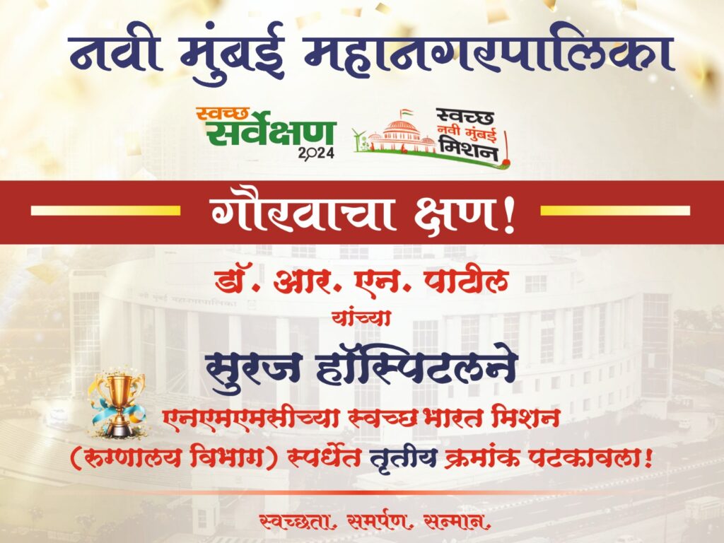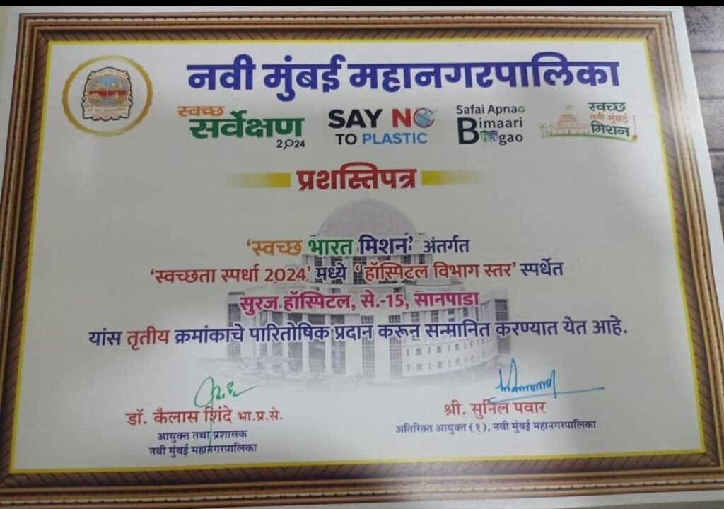 Navi Mumbai Mahanagarpalika is proud to announce the outstanding achievement of Suraj Hospital, Sector-15, Sanpada, in the “Swachh Bharat Mission” and “Swachhata Abhiyan 2024” under the ‘Medical Hospital Division’ competition!